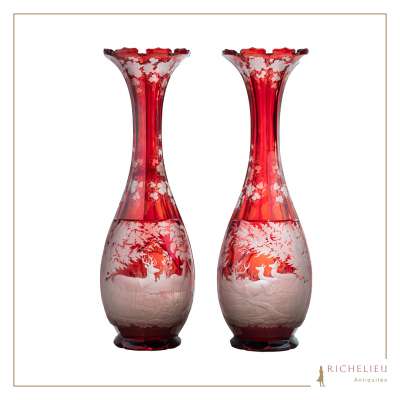 Paire de vase rubis scene de chasse cristal de Boheme 19 eme siecle