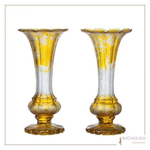 Paire de vase miel tailles et graves sc. De chasse cristal de Boheme 19eme siecle