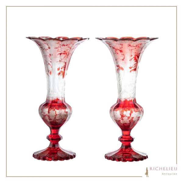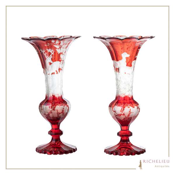 Paire de vase rubis scene de chasse avec un chien 19eme