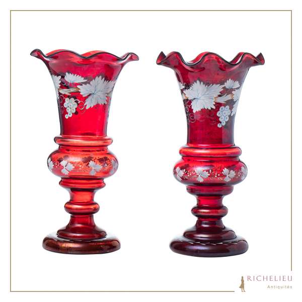 Paire de vases rubis emaille fleurs blanche dentelles 19eme siecle